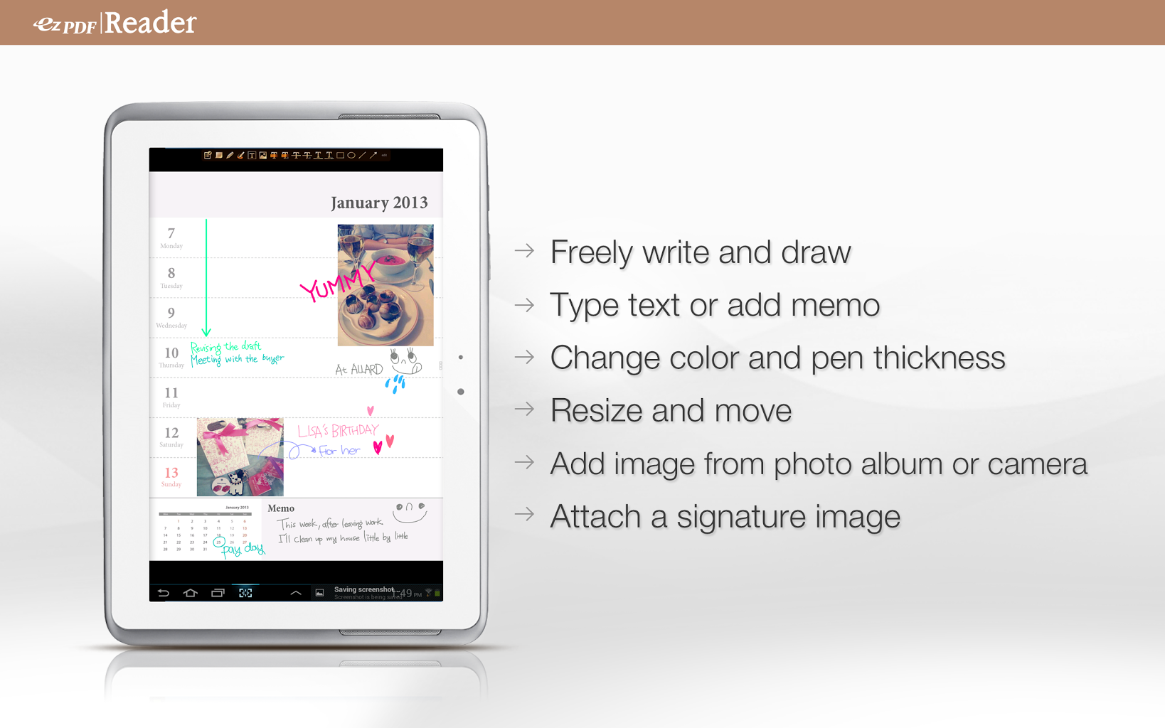 ezPDF Reader is the best selling, best rated and most commented Multimedia and frame-animation PDF viewer, annotator, form filler and paperless solution. This was nominated for the Finalists of 2014 Tabby Awards /Business. http://tabbyawards.com/business/2014-finalists/ ♠ ♣ ♦ ♥ We are currently working on a new set of apps for education. Please check out this video - https://youtu.be/GtvZl9LV124 If you are an educator and interested in testing this solution, please feel free to contact us, android at unidocs.com. Free content App Available from Google Play - https://goo.gl/18fNG8 ● For KITKAT users, ability to write to SD Card has been restricted. Please use the following steps to avoid this restriction. 1. Select "Open from Document Provider" from All PDF tab 2. If you do not see SD card option, go to Settings. Turn on "Display advanced devices" 3. Go to SD card from the option. 4. Open PDF You can also access this from the left side menu while viewing a PDF file. Select from "Open in New Tab" to access multiple PDF files. Guide: http://goo.gl/hH7l08 ● Other Apps 1. "Cup PDF" - PDF Clipping PDF & Share 2. "ezPDF CLEAR" - The world's first Interactive PDF Test Player for education 3. Download "ezPDF Reader G-Drive Plugin" for Google Drive and "ezPDF Reader Widgets" ● More News -. Free Trial version, Search "ezPDF Reader Free Trial" -. Volume License version is available for your organization. -. The license is not transferable for iOS versions or other Android stores. ● App Review "Android Apps for Business: 10 Low-Cost Mobile Tools You Should Know About" by eWeek (http://bit.ly/LJTtEH) "Plenty of PDF readers are available for Android devices, and a number of them are free. But ezPDF is by far the best of the bunch." Daniel A. Begun, author of Amazing Android Apps For Dummies ● Customized Viewing with flipping DUAL PAGE VIEW supported! Scanned and text based PDFs are all supported, including JPEG2000 and JBIG2 compression. Select Text Reflow, Fit to Text Column, Copy and paste text in PDF view and bookmark as you go. ● PDF Form Filler Fill out your PDF form, sign and send via email. ● Multimedia PDF Viewer - Audio, Video, Animation GIF and Read Aloud Plays multimedia files, animated GIF, zipped PNG files embedded into PDF. Use Voice Reading feature to have documents read to you with the continuous automatic page-turning feature. (TTS feature from the device settings) ● Annotation Features on PDF The useful tool to add text in text box and sticky notes; highlight, underline, or strikethrough texts; draw many shapes. Add memo & append images, change color / thickness, resize and move them around as you like. Compatible with Adobe ® Acrobat ®. ● More Features -Form calculations supported -Support ePub -Text View with reflow function. Night/Day Mode, Change font size & color (text and background) -Search (Case sensitive, whole word or part, exact word, and/or operator) and highlighted result -Auto Fit Zoom for multi-column article or removing white margin -Crop / Rotate page -Able to select text in PDF, save to clipboard, web search, share with other apps, check with dictionary (Support ColorDict) -Support hyperlinks (Go to page within the PDF, PDF to PDF, URL links to webpage) -Open Standard Password-protected PDF -Intuitive bookmarking & viewing bookmarks with its description and ribbon & thumbnail image -Auto Page Turn (secs) or Auto Scroll (up a screen full) -Table of Contents -Thumbnail scroll images -Jump to a specific Page No. -Change reading direction - Arabic, Chinese, Japanese & Hebrew -Page Turning Effect Tap Options -5-point-tap : Annotation Toolbar -4-point-tap : Notification Bar -3-point-tap : PDF ←→ Text Reflow -2-point-tap : Reduces the page to fit the width when enlarged -1-point-tap : Menu