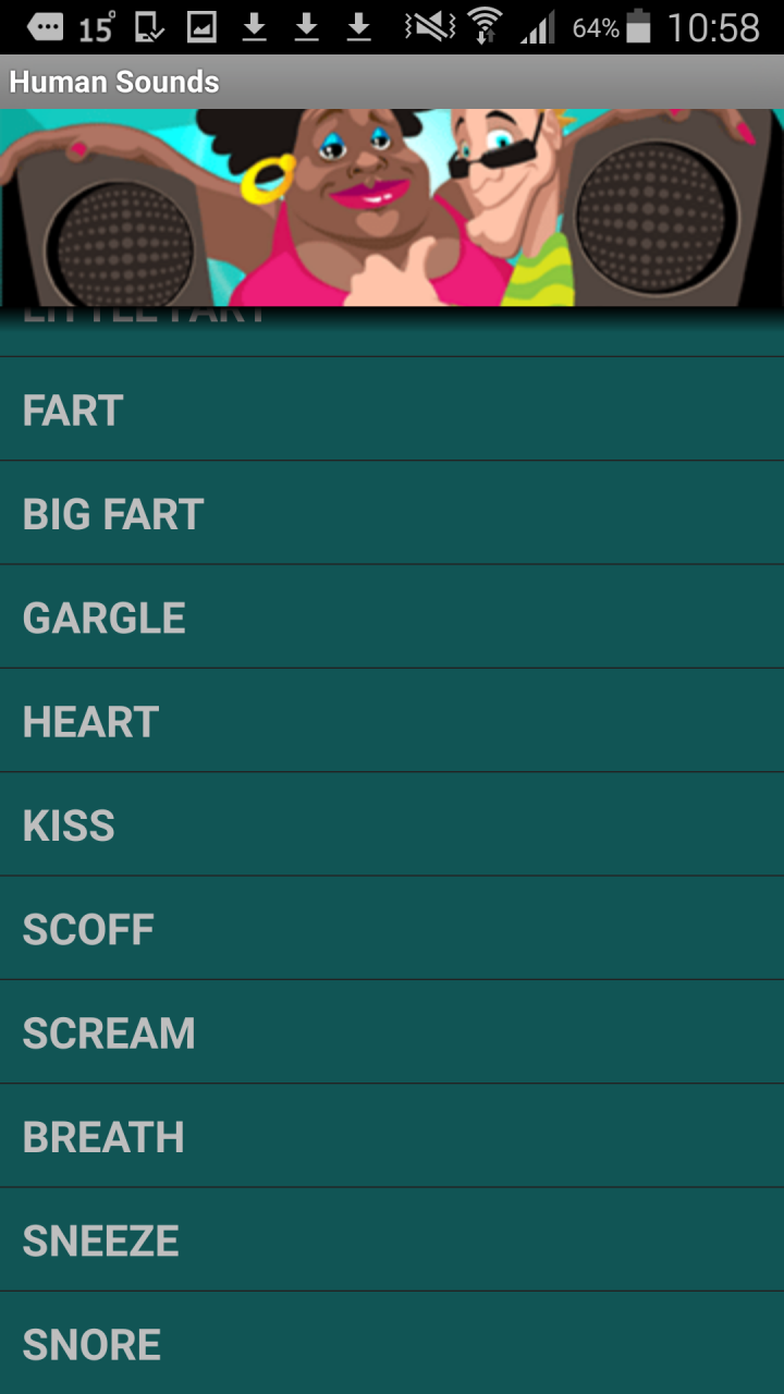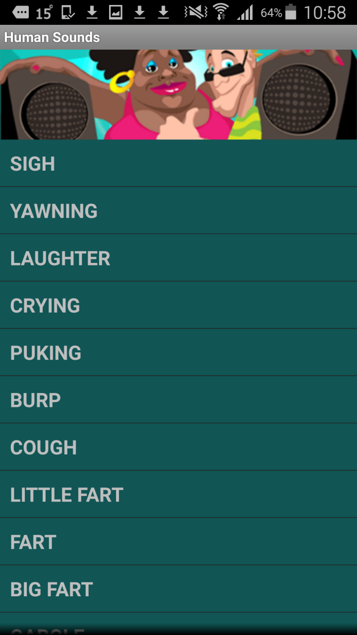 Human SoundBoxInlogic GamesAge 3+DownloadDownloadDo you want to have fun, amuse your friends, or play with your child? Human Sound Box is an application full of various human sounds, such as cough, laughter, crying, etc. Don't hesitate and Have Fun! More3.5StarsDeveloperInlogic GamesSize2.26 MBWebsitehttp://www.inlogic.skCategoryActionVersion1.1Rating3.5Emailinlogicgames@gmail.comPlay Human SoundBoxDownload the club app with all great games to play Human SoundBox.OK