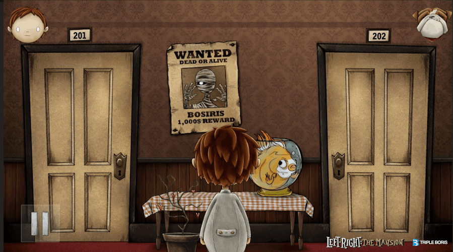 Left-Right: The Mansion is a little game about a boy, Billy, whose dog named Gigi ran away inside a big mansion. He must journey through this mysterious place, where he will have to find and remember the right path in order to find her. Every room will challenge him with a simple choice to make: left or right. Two doors, yet only one will make him go forward; the other one will bring him back to the beginning. Left-Right is a memory game filled with strange creatures and scary bosses who will try to stop Billy from finding his dog. It is a pretty simple and fun 2D game inspired by the old NES classic games Punch Out and Contra, for which, even after all these years, we still remember the button sequences to avoid the punches or get 30 lives. The human memory is a very fascinating thing, and Left-Right is here to test its limits. Will you be able to help Billy find Gigi? Or will she be trapped forever in this crazy mansion? Enjoy!